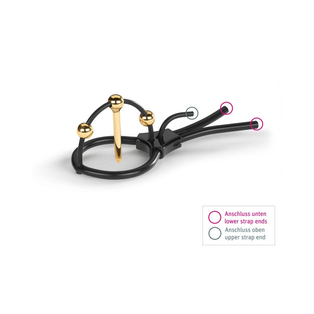 For the fancy: With his 24K gold-plated urethral sound flanked by two golden balls our Plunging Pete stimulates the glans from both outside and inside. The urethral probe has a slim diameter of 4 mm that is easily inserted even if you've never done that before. The short length of 35 mm takes good care that it is the tip and nothing but the tip that gets flooded with tingly goodness. Around the balls and the probe the tingling and pulsating is especially intense because the gold not only makes the stimulation more even but also focuses the sensation where it touches the skin. And because every corona is a little different you can move the golden elements along the upper strap to those points where the stimulation feels best. Like his cousins Pure Pete who abstains from any gold whatsoever and Pearly Pete who features three gold balls Plunging Pete consists of 100% medical-grade platinum silicone; that makes him not only very hygienic but also easy to clean. The lengths of his two straps that go around the corona and over the tip are continuously adjustable so that you can fit Pete's size perfectly to your anatomy. Before we let Plunging Pete out to play the probes and balls of each and every one are checked by hand before he gets all wrapped up in a neat black metal case which also contains the matching electrode cable for our e-stim devices.