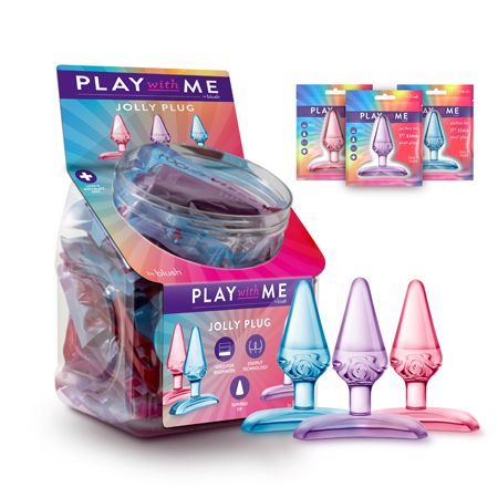 The Jolly Plug from Blush is the perfect anal toy for beginners if you're just experimenting with your pleasure or if you have been hesitant to try anal play. This large fishbowl display Contains 24 Pieces - 8 of Each Color (Pink Purple and Blue). Each plug is individually wrapped and has a tapered tip for easy insertion. They are small enough for long-term wear and comfort during anal training. The Jolly Plug has StayPut™ technology for security ensuring it will stay in place when you play. The flared base ensures your safety during use and the fun colors bring a little something extra to your wellness routine!