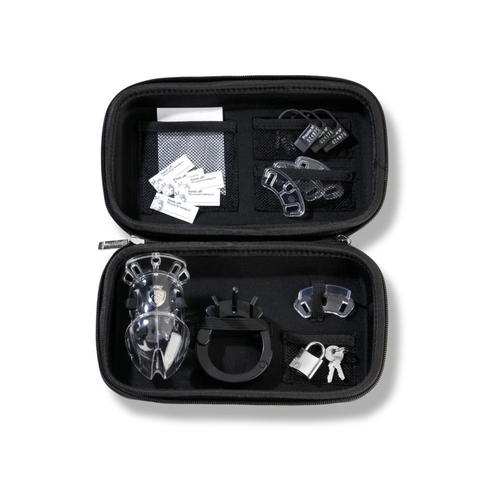 The Pubic Enemy No 1 is a neat and transparent cock cage with e-stim function: He keeps a boisterous willy pent up under lock and key so that he can't get stiff until the mistress or the master comes with the key and lets him out. With the conducting surfaces left and right the prisoner can be treated with tingles twitches or pulsations in precisely the intensity he deserves. Because his conductive surfaces can be taken out in no time at all this chastity belt for wayward gentlemen is perfect even for those who haven't yet discovered e-stim. And if a prisoner gets too cocky later the conductivity can easily be restored.