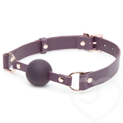 Deluxe leather and silicone ball gag for intermediate gag play. Eight-hole buckle-fastened straps adjust between 19.5 to 25.5 in. around. Silicone ball is hypoallergenic odorless and tasteless. Finished with ornate rose gold metalwork. Ball measures 5.5 in. circumference and fills sub's mouth. Supplied in a luxurious velveteen bag.
