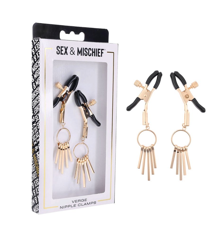 Unleash your imagination and explore your desires with the Verge Nipple Clamps. Designed to engage your senses the adjustable clamps provide just the right amount of pressure to stimulate your erogenous zones creating an electrifying experience that will leave you craving for more. Wear them during solo play or share them with a partner to add an exciting element of kink to your intimate moments. Let your fantasies run wild as you indulge in the sensations that Verge Clamps provide.